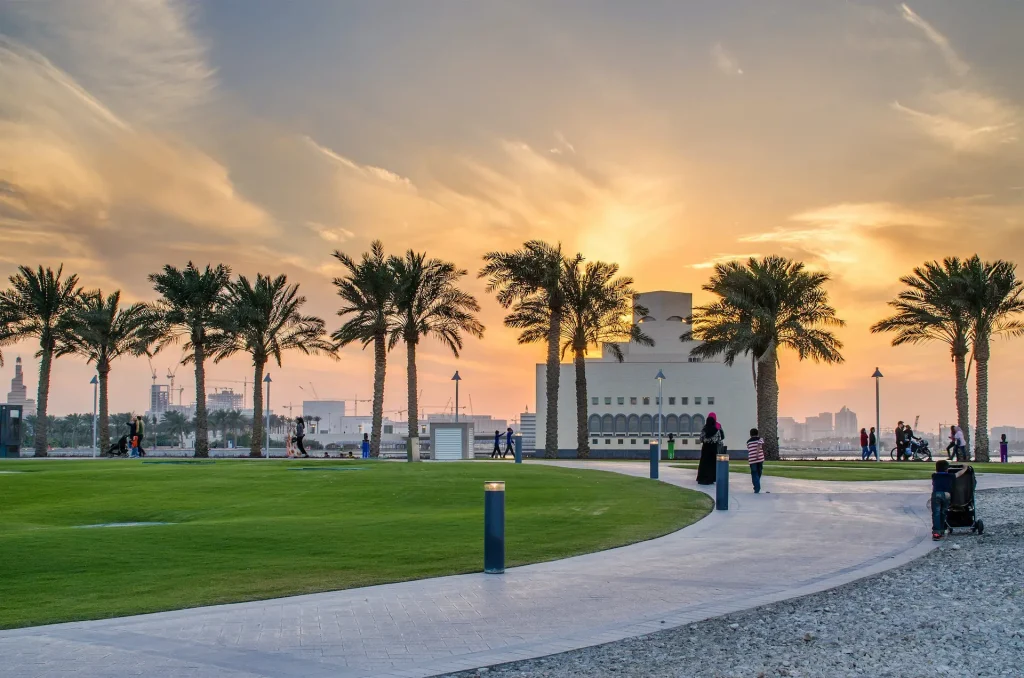 يعد كورنيش الدوحة واحداً من أكثر المواقع شهرة لمشاهدة غروب الشمس في العاصمة. يمتد الكورنيش على طول الواجهة البحرية، ويمنح الزوار إطلالات بانورامية على أفق منطقة ويست باي المتلألئ. المكان مثالي للمشي، ركوب الدراجات، أو التقاط الصور الفوتوغرافية الرائعة عند غروب الشمس.